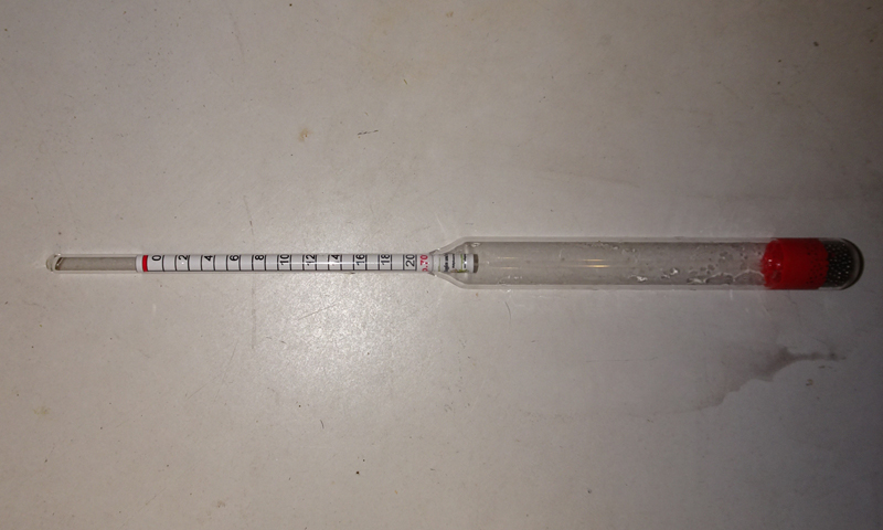 Nach dem Läutern kommt zunächst das Überschwänzen. Dazu gießt man maximal 77 °C heißes Wasser über den Treber, um ihn nochmal auszuwaschen. Anschließend entnimmt man dem Sud eine Probe für die Stammwürzemessung. Die Stammwürze besteht aus den Stoffen, die beim Einmaischen im Wasser gelöst wurden. Das sind hauptsächlich Malzzucker, Proteine, Vitamine etc. Für die Messung wird eine Bierspindel benötigt. Diese schwimmt in der Probe und zeigt auf einer Skala den Stammwürzegehalt an. Der Stammwürzegehalt für ein Pils liegt bei etwa 11%. Ist der Wert zu niedrig muss erneut überschwänzt werden, bis die gewünschte Stammwürze erreicht ist. Ist der Wert zu hoch, kann der Sud mit Wasser gestreckt werden.