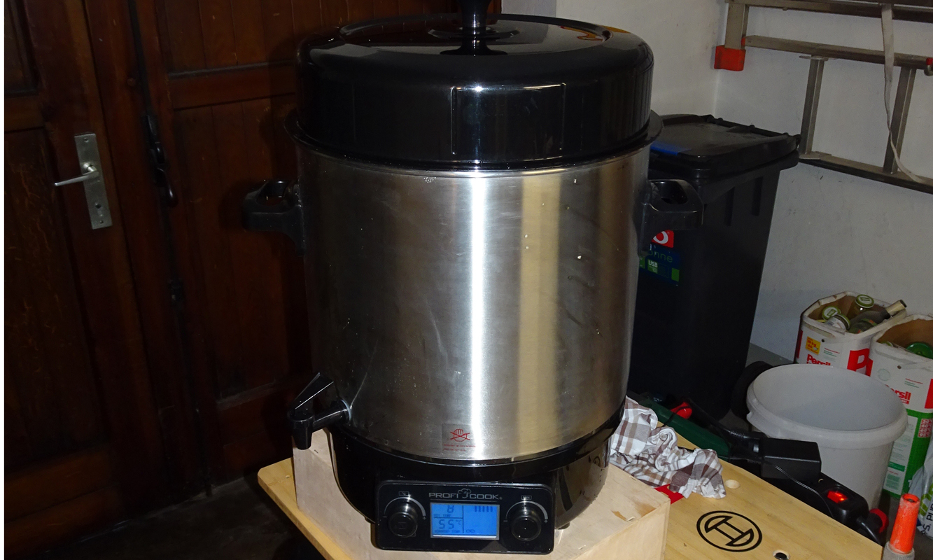 Unser erster eigener Kocher war ein 27 l "Einkocher und Heißgetränkeautomat" der Firma "Profi Cook".