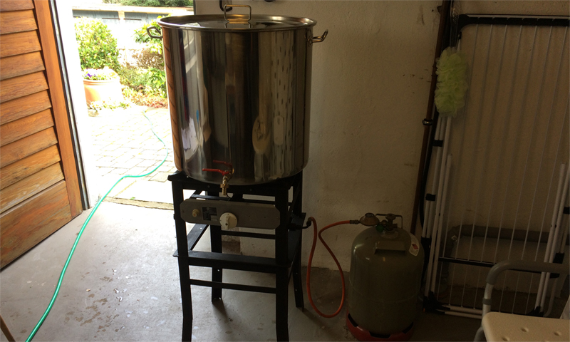 Nachdem unser erster Kocher kaputt gegangen ist, haben wir uns entschieden, beim zweiten Kocher eine Nummer größer zu wählen. Da es im Bereich Einkoch-/ Heißgetränkeautomaten kaum Kocher mit einem Fassungsvermögen über 30 l gibt, haben wir uns für einen 100 l Edelstahltopf entschieden. Dazu haben wir einen Auslasshahn gekauft und unten an den Topf montiert. Es würde sehr lange dauern, 60 l Wasser mit Strom zu erhitzen. Somit haben wir uns für einen Gas-Hockerkocher entschieden.